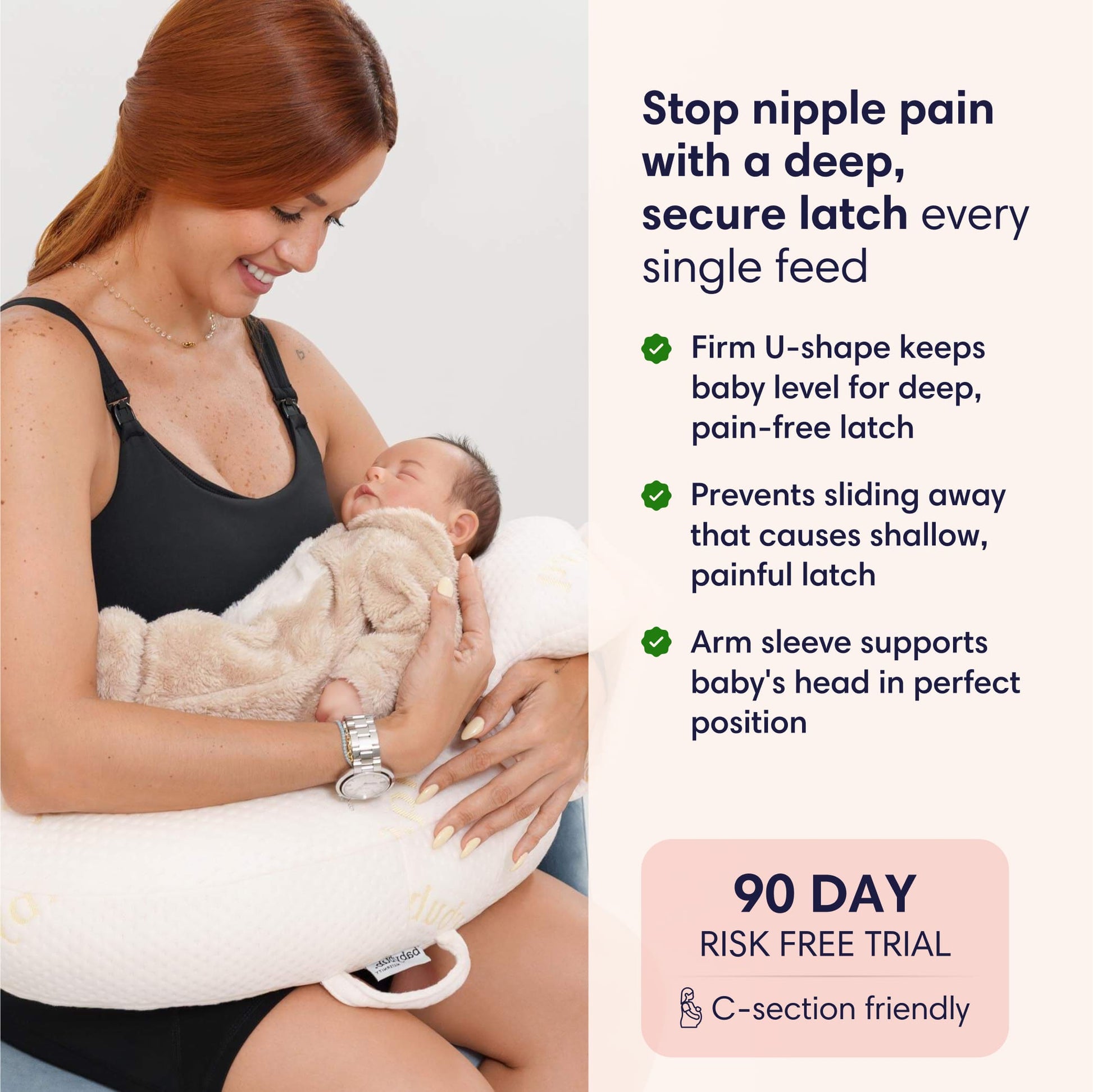 The firm U-shape lifts baby to nipple height so you can sit upright instead of hunching. Your shoulders relax, your wrists rest, and latch improves—all at once.