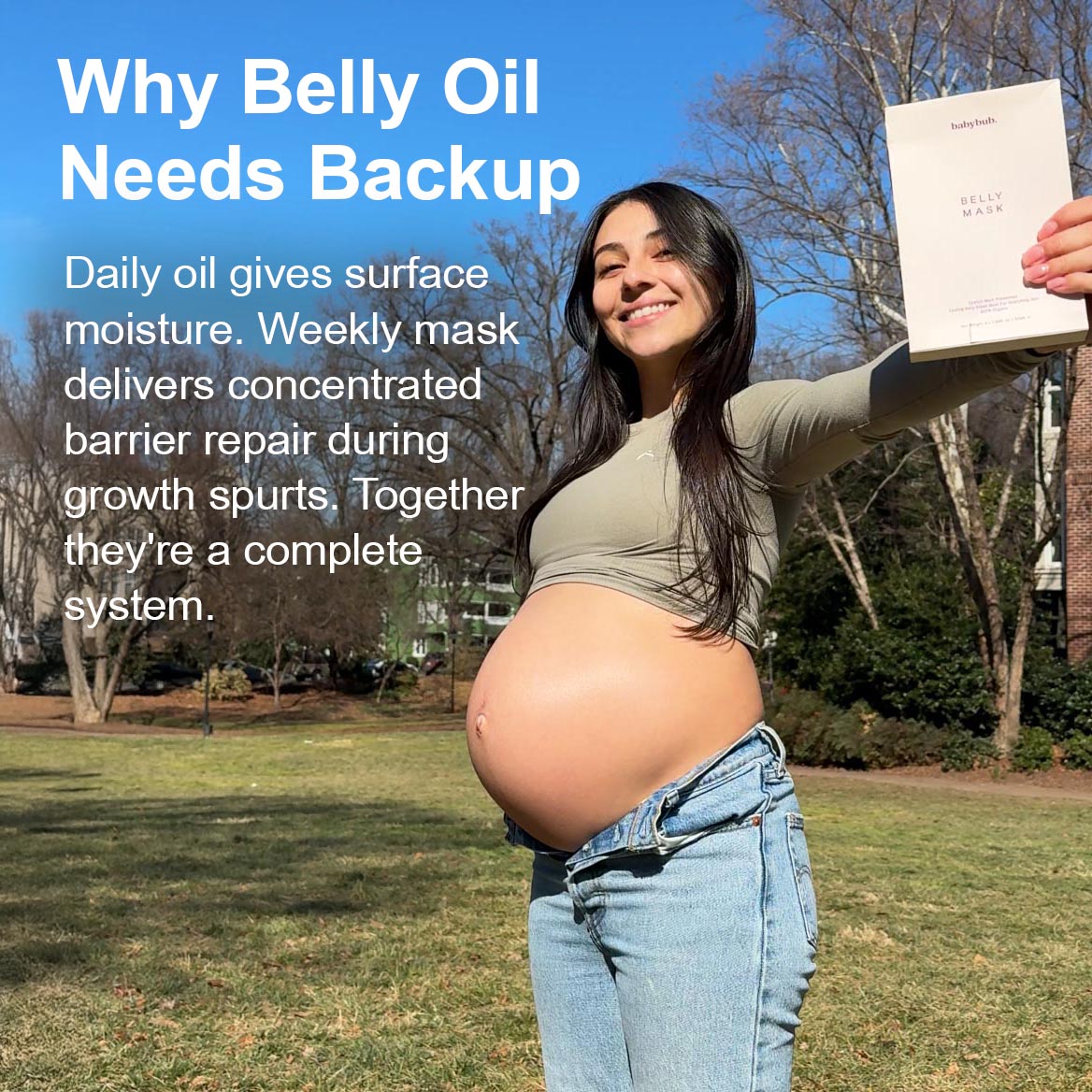 Why a mask instead of just using my belly oil? Daily oil provides baseline moisture. Masks deliver concentrated serum with barrier-rebuilding ceramides that force deep absorption. Think of it as weekly intensive treatment while your oil is daily maintenance. Together they're more effective than either alone.