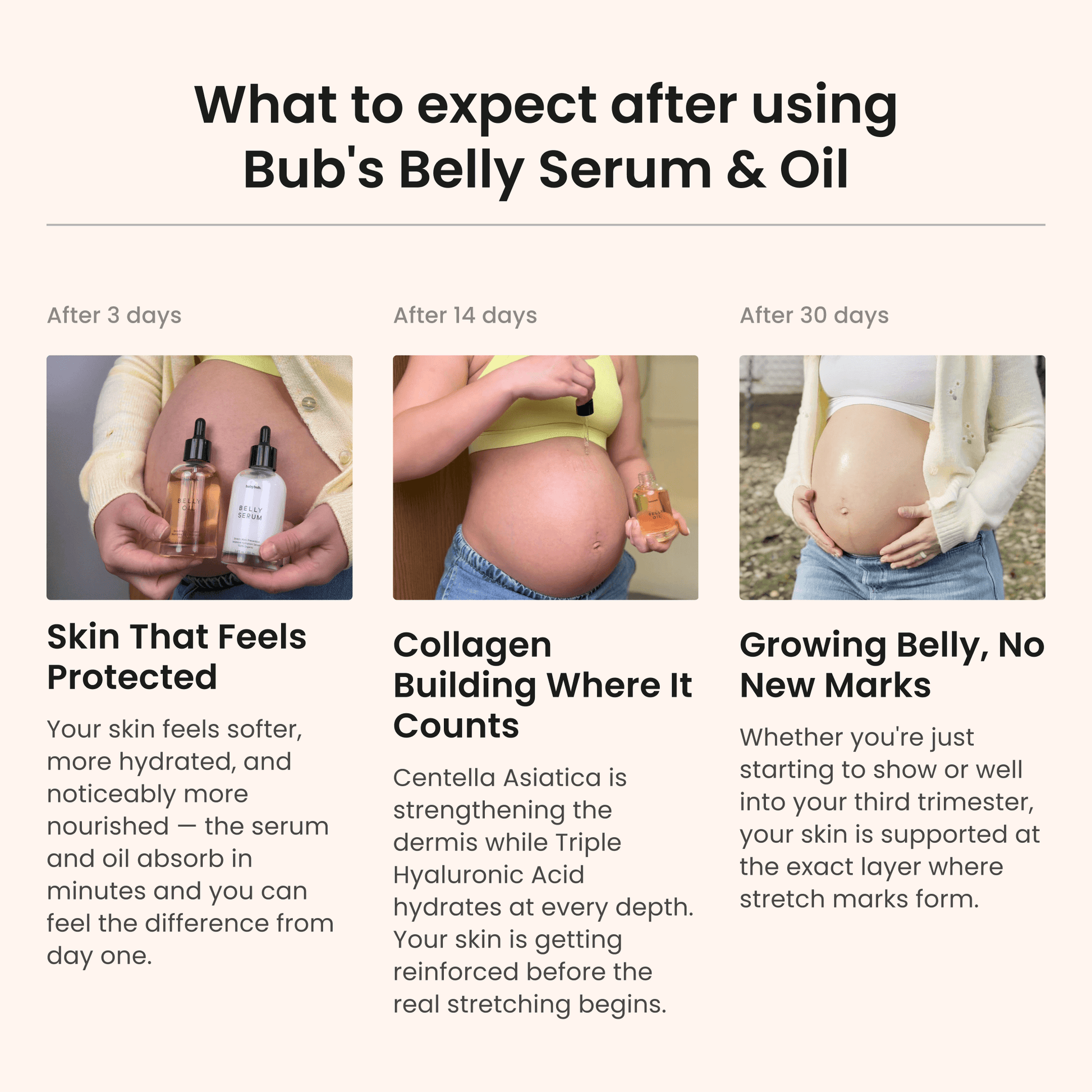 Bub's gives you patent-level barrier-rebuilding technology like premium brands, but treats both belly AND face in one effortless weekly ritual - at a price that makes sense.